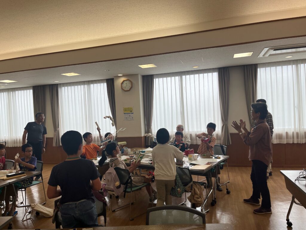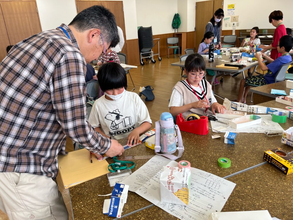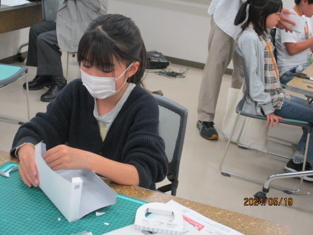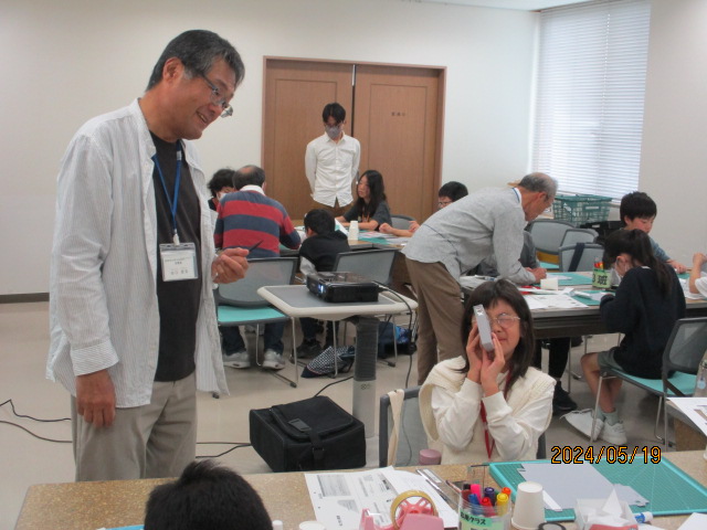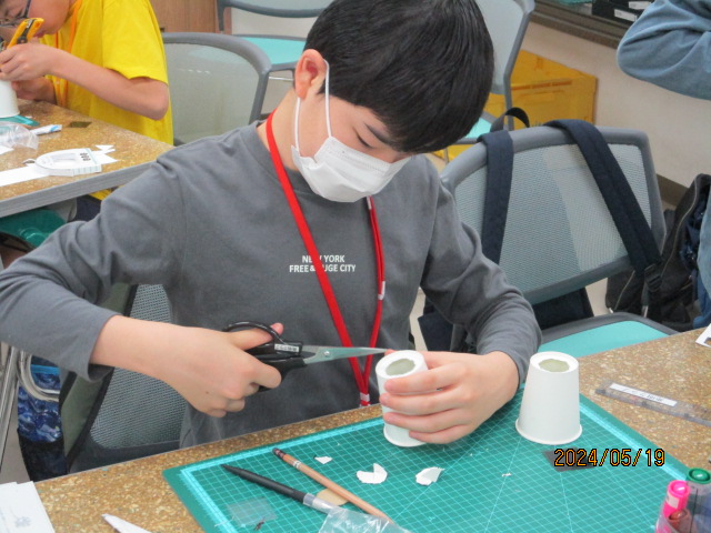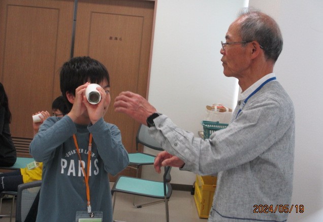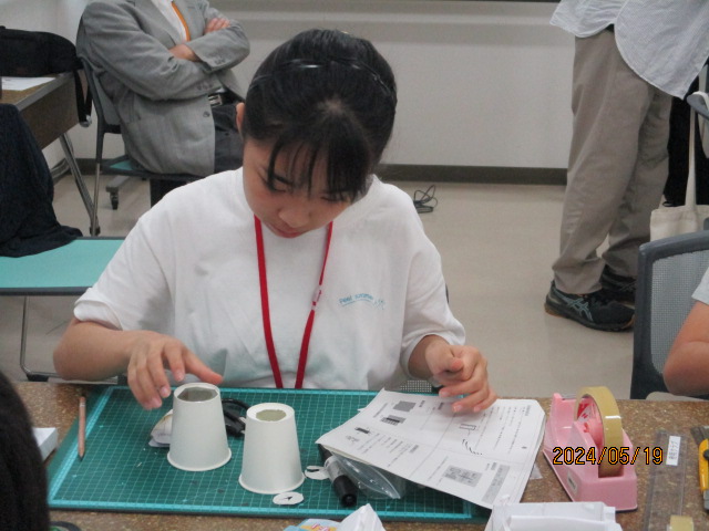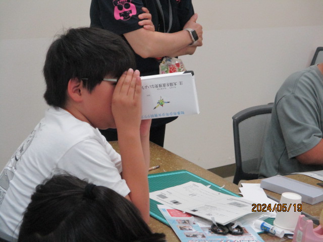 基礎クラスでは紙の特性を学びました。1枚の紙を工夫して、どれだけ重たいものを載せられるかチャレンジしました。ゴムを使用してびっくり箱も作りました。 応用クラスでは分光器と偏光万華鏡を作りました。なにが見えたかな?