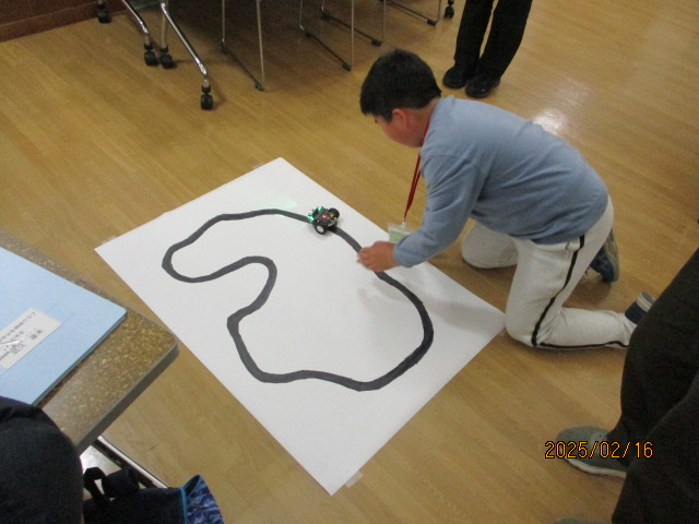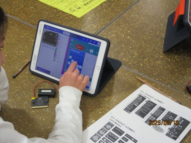 マイクロビットを使ったプログラミング講座。午前はランダムの数字を使った、じゃんけんゲームの制作。午後はラインセンサーやモーターを使ったライントレース走行ロボットの制作。