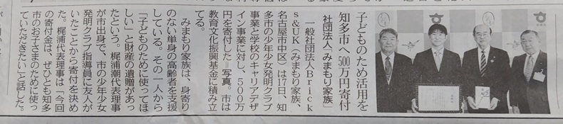 Posted in未分類 発明クラブへ寄付をいただきました。 Posted by By 事務局 2025年3月29日No Comments 事務局の安藤です。 「一般社団法人Bricks&UK(みまもり家族)」様から活動費用の寄付をいただきましたので、中日新聞に掲載された記事と合わせて紹介します。 令和7年度以降、毎年の活動に使う機器等の購入費用に充てる予定です。 クラブ員のみなさんは、道具を大切に、楽しく積極的に活動に取り組みましょう! 「一般社団法人Bricks&UK(みまもり家族)」様、本当にありがとうございます。 ↓↓ Webサイトはこちらです。 https://mimamori-kazoku.org Share via: Facebook X (Twitter) LinkedIn More 事務局 View All Posts Post navigation Previous Post ライントレースNext Post令和7年度 開講式